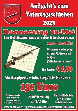Wir freuen uns in diesem Jahr wieder unser Vatertagsschießen veranstalten zu dürfen. Geschossen wird an 18. Mai aufgelegt mit Kleinkaliber Gewehr auf Glücksscheiben. Als Hauptpreis winkten 150 Euro.