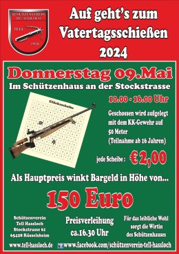 Das Vatertagsschießen in Tell Haßloch findet bereits seit über 50 Jahren in dem Verein statt und ist nach dem Ostereierschießen das zweitgrößte Event. Dabei allerdings das einzige Event, bei dem mit scharfen Waffen geschossen wird. Teilnahme ist somit erst ab 16 Jahren möglich.